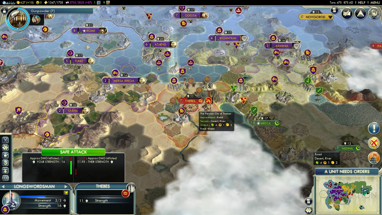 870 AD: The war begins with my Longswordsman assaulting the Persian Pikeman - it is eliminated -